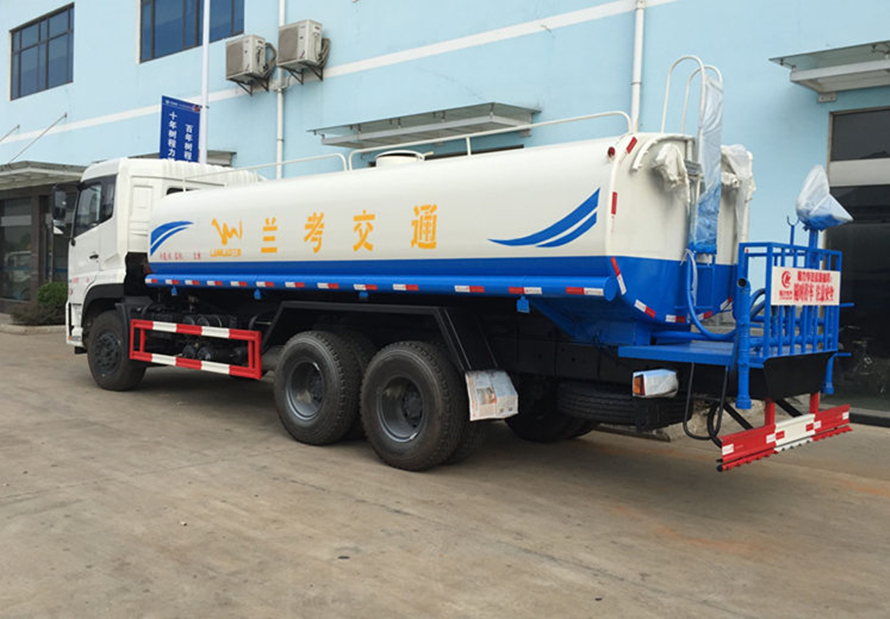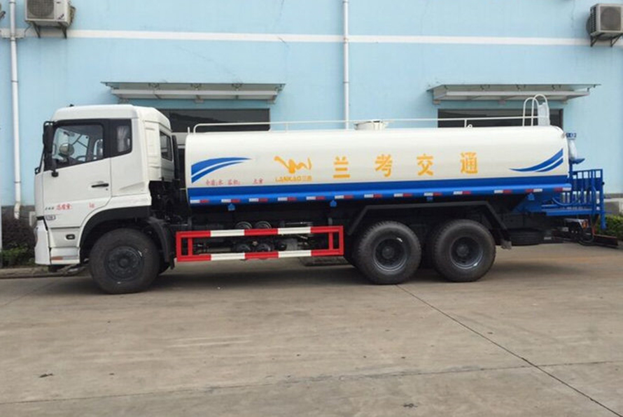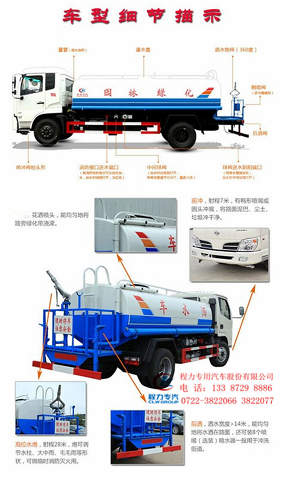 該車僅選用4350+1350mm軸距;2、罐體有效容積:14.49立方米,當選裝普通后平臺時罐體尺寸(長×長軸×短軸)為(mm):6900×2300×1320 采用東風股份公司總部新款駕駛室底盤,國六發動機,8.25R20的鋼絲胎,電動門窗,帶ABS。 罐體實際容積17.5噸,帶前沖、后灑、側噴、高位花灑,后部帶平臺,平臺上安裝綠化灑水高壓炮(炮噴射形狀可調:直沖狀、大雨、中雨、毛毛雨,可連續調節),配備大功率60/90專用灑水泵,帶消防接頭,帶自流閥,帶自吸功能,帶濾網。吸程≥6米、灑水寬度≥14米、45度角時灑水炮噴射距離可達25-30米。 罐體全部采用武鋼產4mm國標碳鋼板, 前后封頭采用國家標準對接焊,機械折邊,一次性壓制成型。整罐為直縫焊一次成型,圓弧形對接焊封頭,抗沖擊力和拉力強。罐體的截面形狀為橢圓形或方圓形,內部制造成多倉室結構,各個倉室用加強防波隔板隔開,以減輕汽車行駛時罐體內水的沖擊和提高罐體的強度。隔板與罐體之間采用焊接剛性連接形式,防浪板包邊處理,隔板下端有通孔。罐體的頂部開有出入孔。